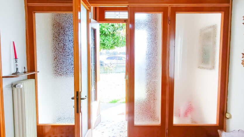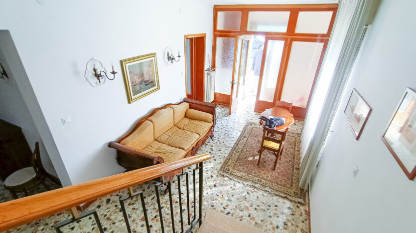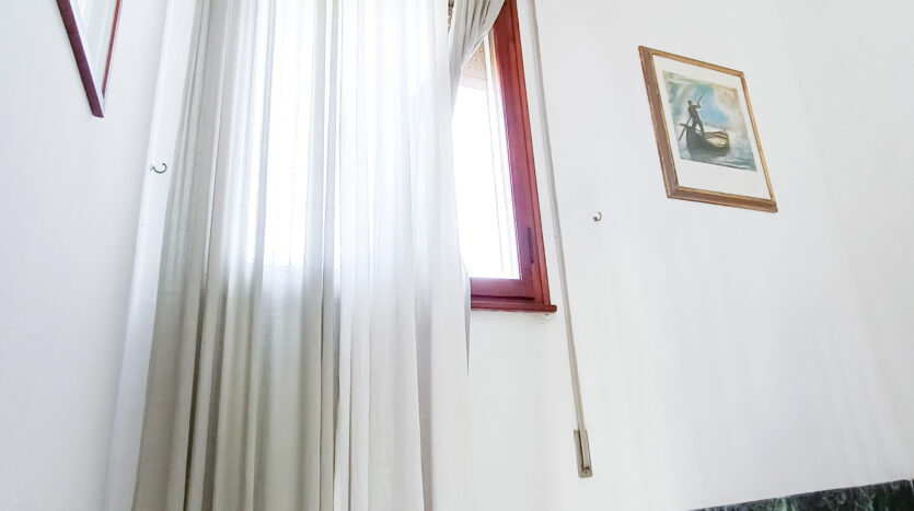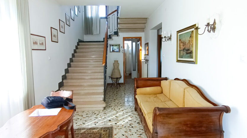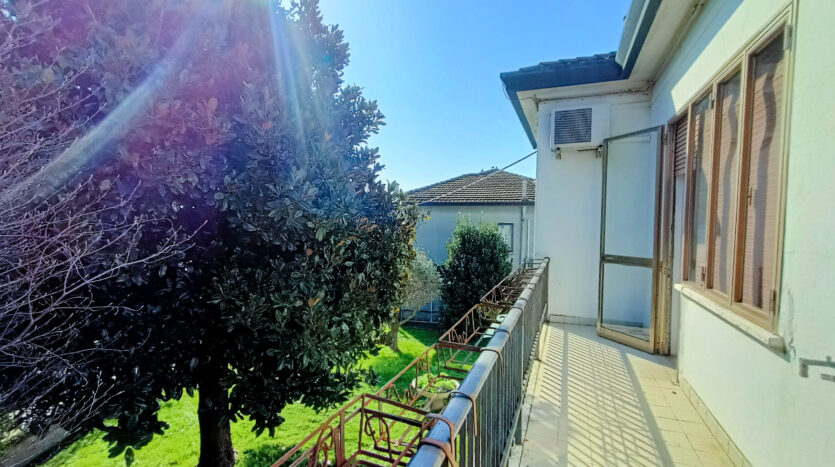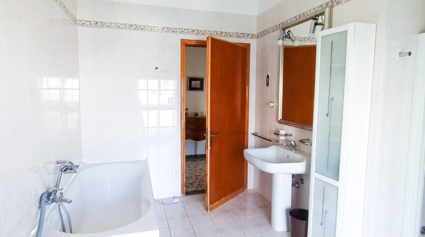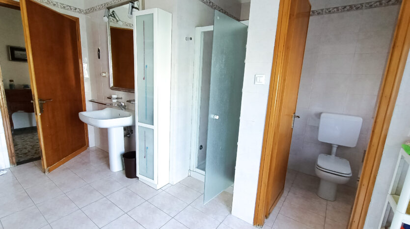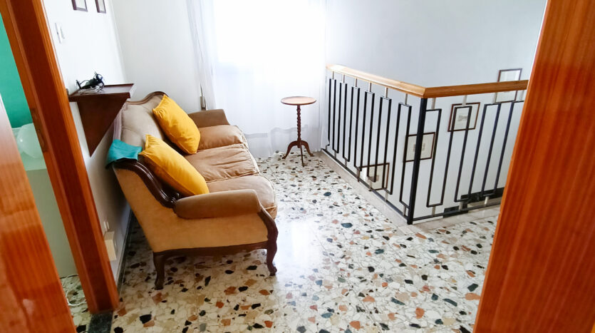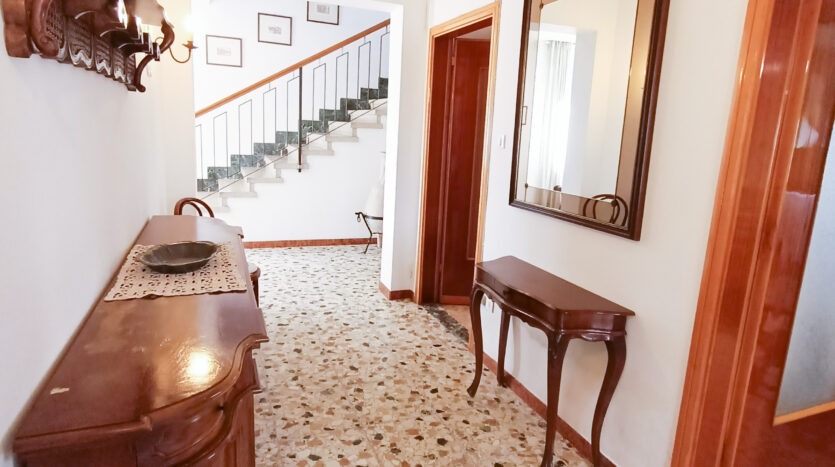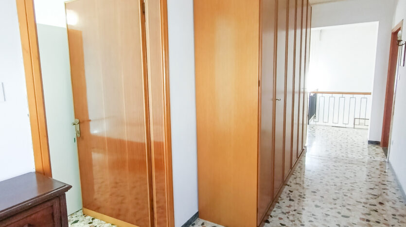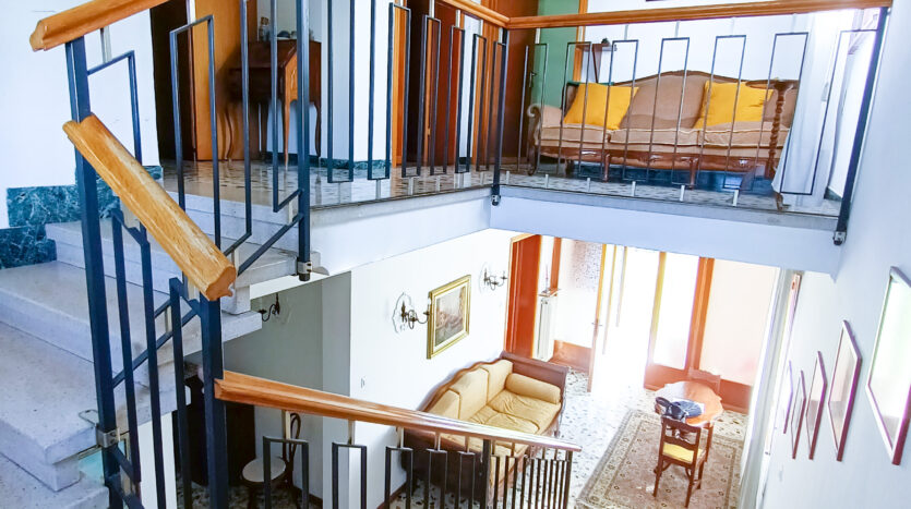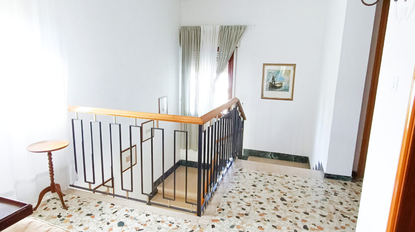 L’abitazione ha una superficie di 230 mq e si sviluppa su due livelli fuori terra. Al piano inferiore troviamo l’ampio ingresso, il corridoio con porta di servizio, il soggiorno, la sala da pranzo con cucina a vista comprensiva di caminetto, lo studio ed il disimpegno che conduce al bagno wc e alla centrale termica dove è collocata la caldaia; salendo l’ariosa scala in graniglia beige, si raggiunge il piano superiore dove troviamo il ballatoio, il corridoio, le 2 camere da letto matrimoniali, le 2 camere da letto singole (di cui una con terrazzo) e l’ampio bagno padronale con terrazzo. Il sottotetto è accessibile attraverso due botole d’ispezione.