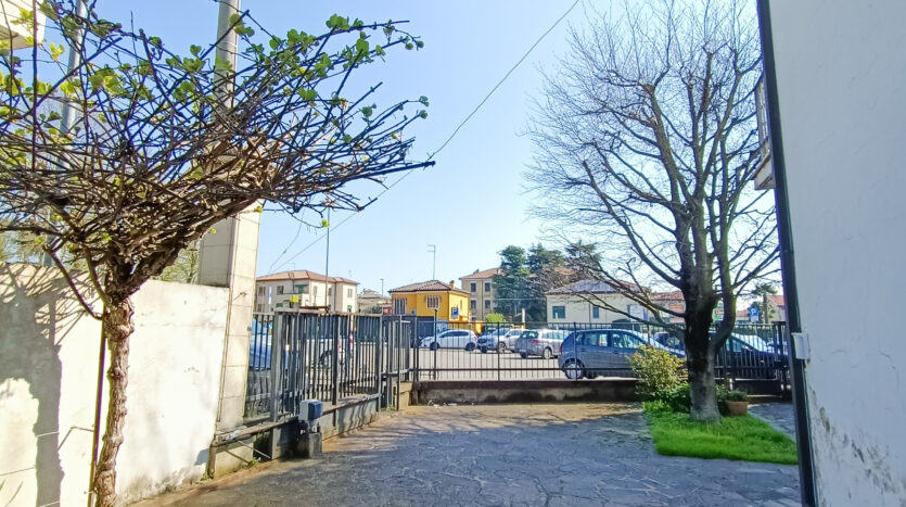 L’immobile è circondato sui 4 lati dal cortile di proprietà completamente recintato, con 3 lati adibiti principalmente a prato ed un lato totalmente pavimentato in porfido ad opera incerta, dove si sviluppano i vialetti di accesso, carraio e pedonale, ed insiste, in corpo staccato, il garage di 27 mq.