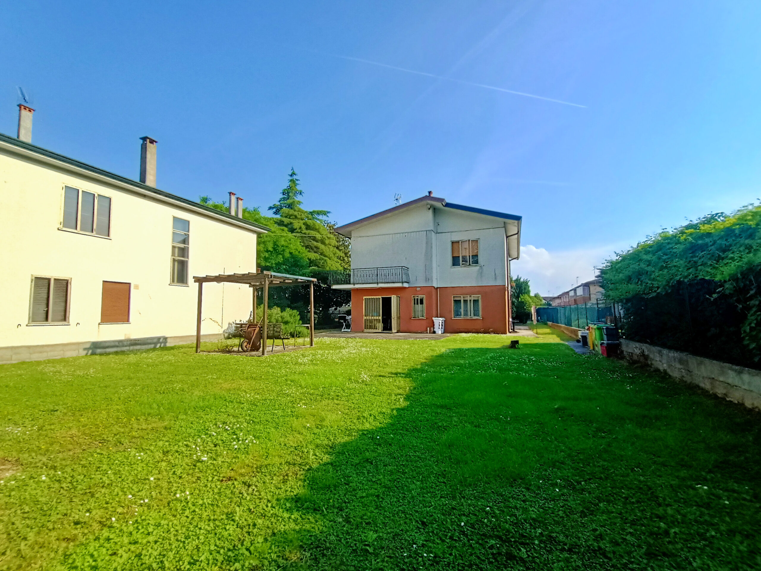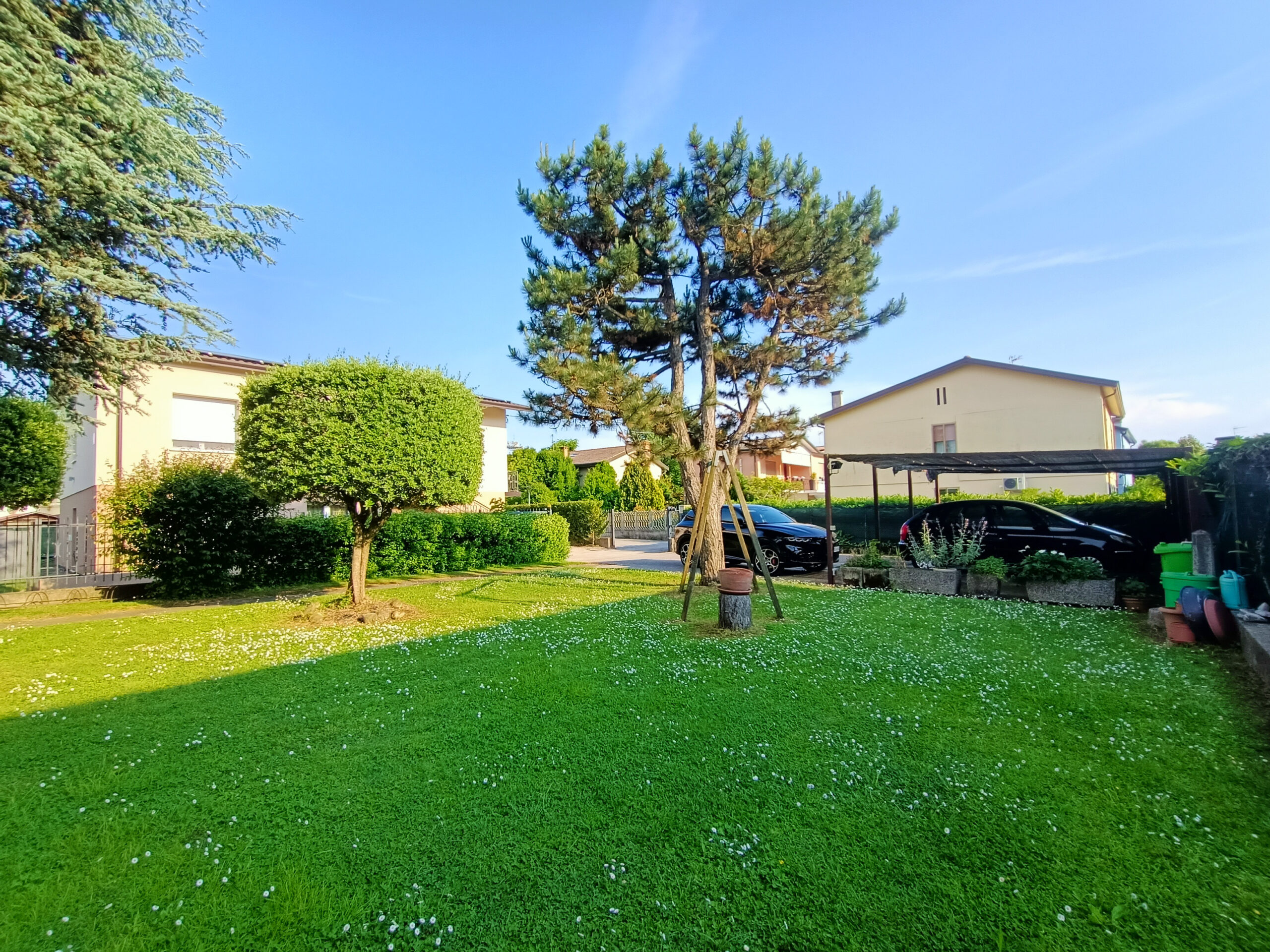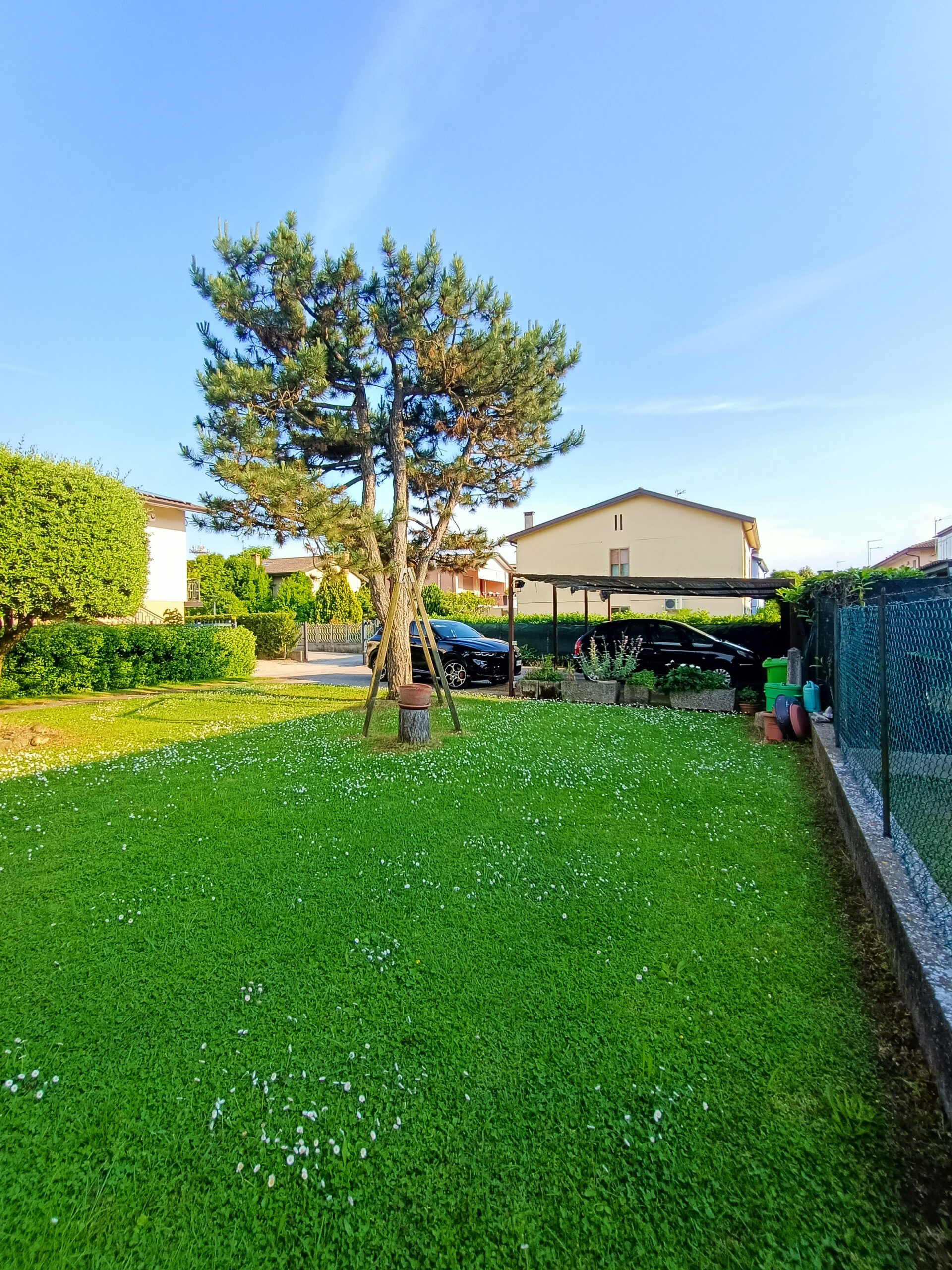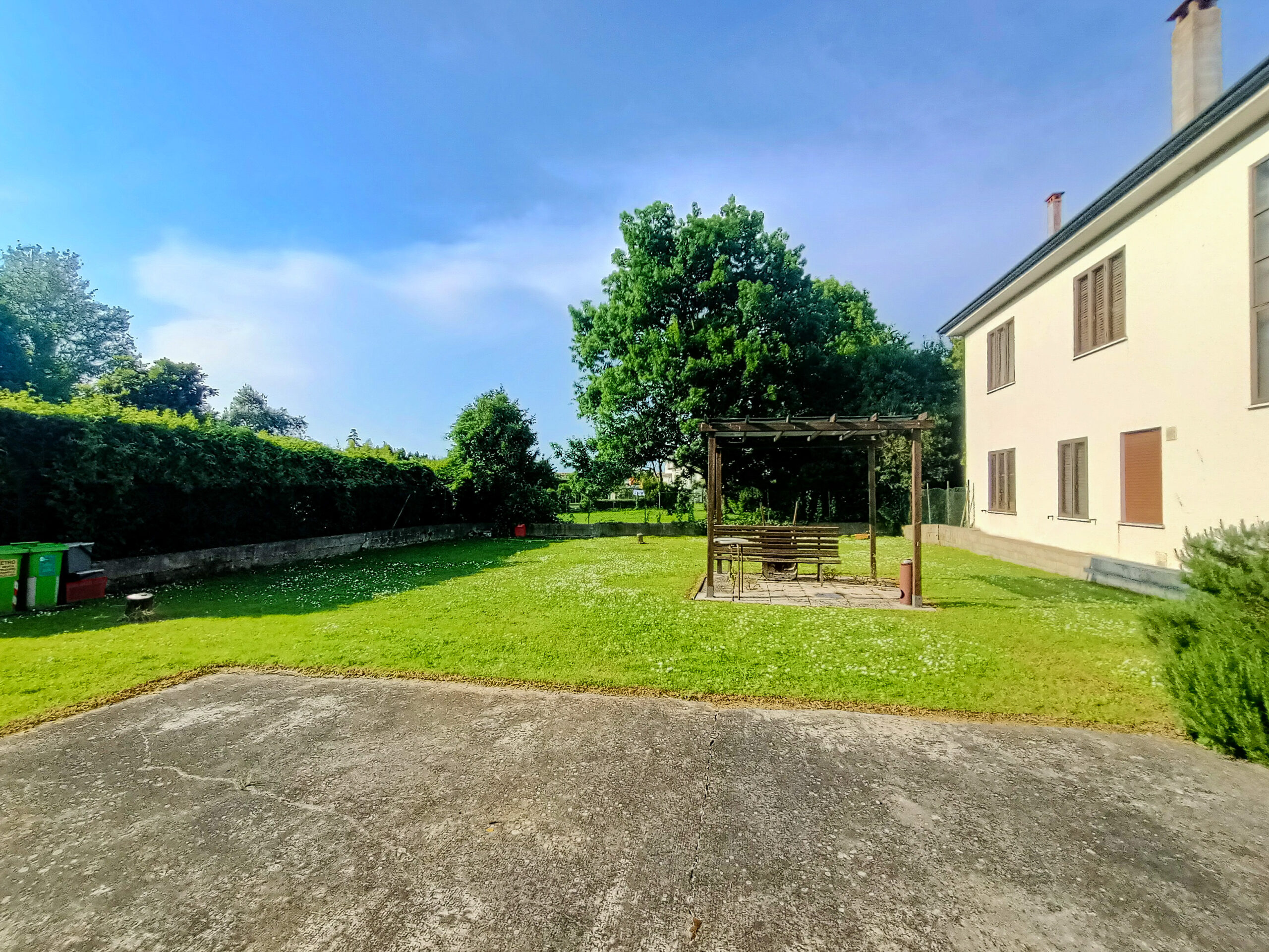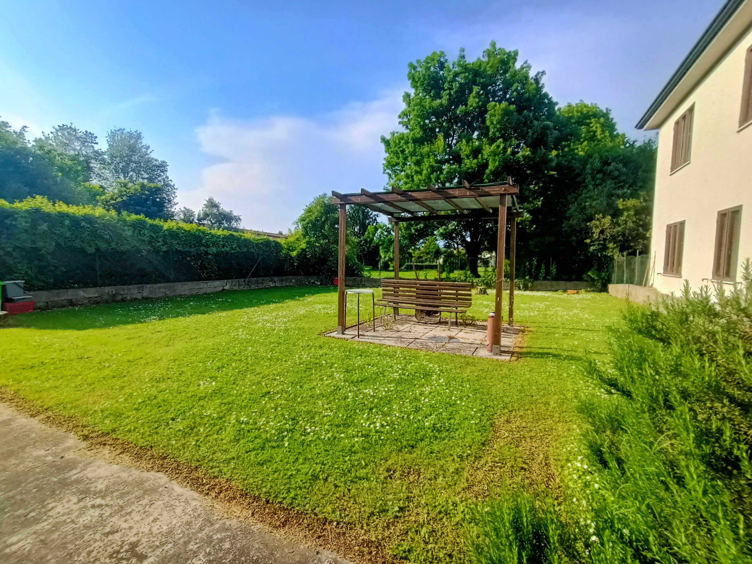 L’intera abitazione è circondata da un rigoglioso prato verde che si estende su una superficie completamente recintata di circa 1000 mq, arricchita di alberi ombreggianti ed alcune siepi che regalano ossigeno e ristoro durante i mesi più caldi. Sul fronte è presente un ingresso carraio, con pavimentazione in cemento, ed una pergola con rete ombreggiante per mettere al riparo fino a 3 auto.
