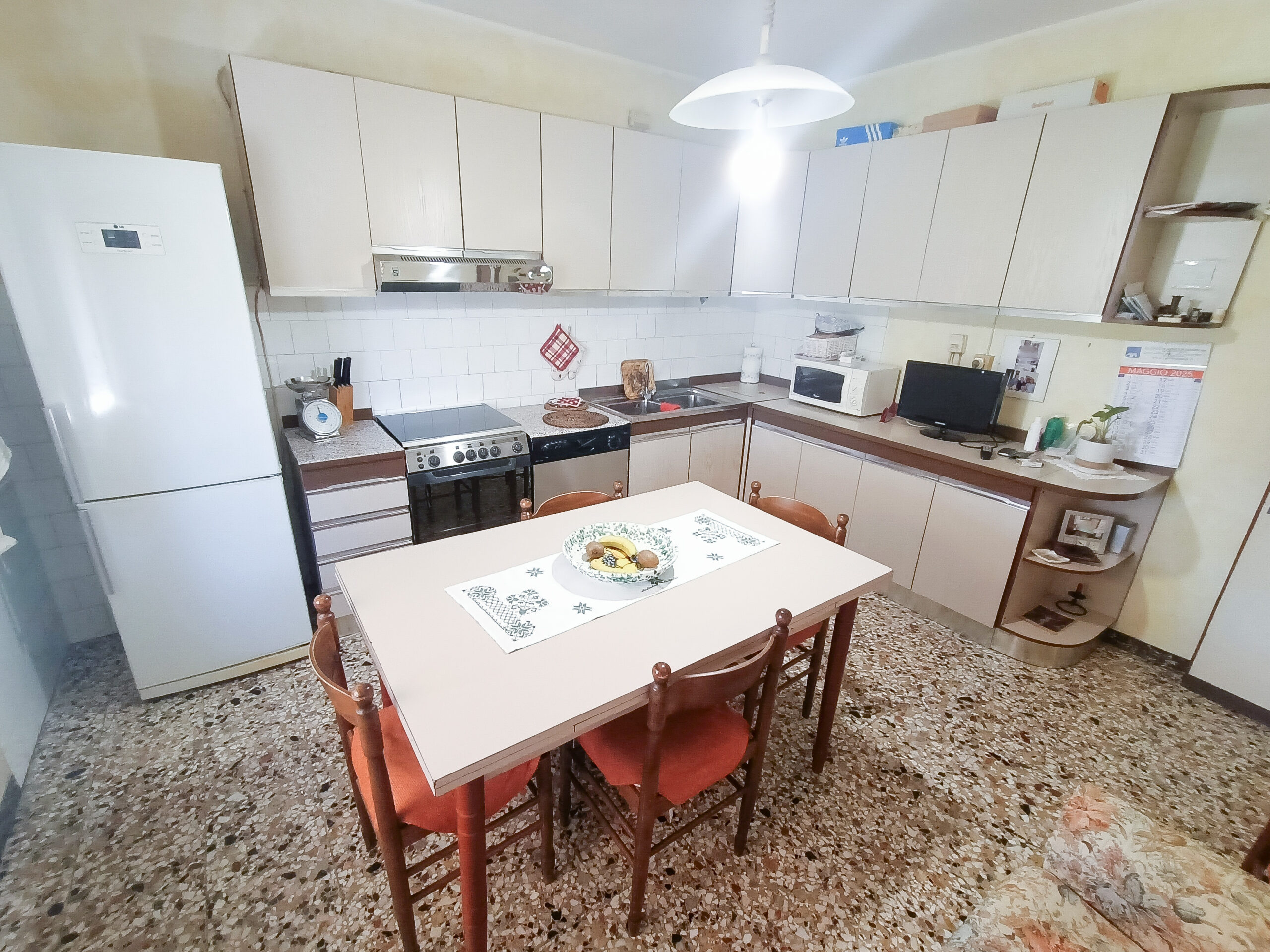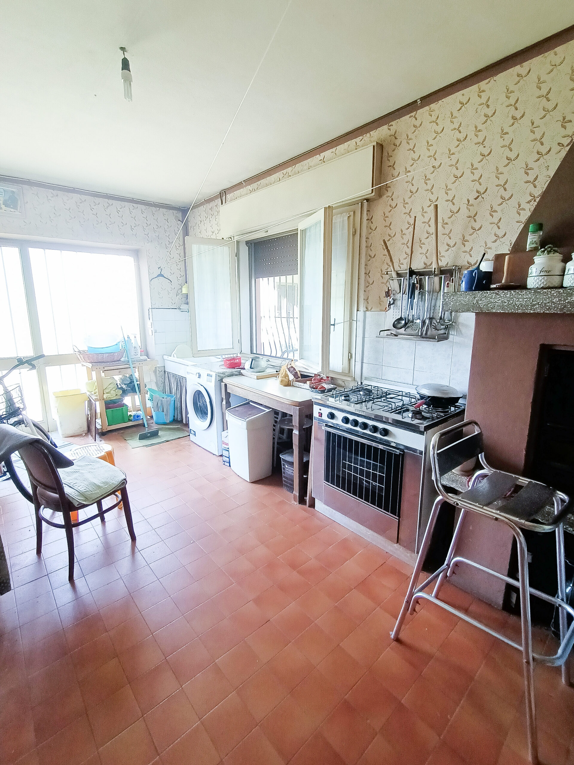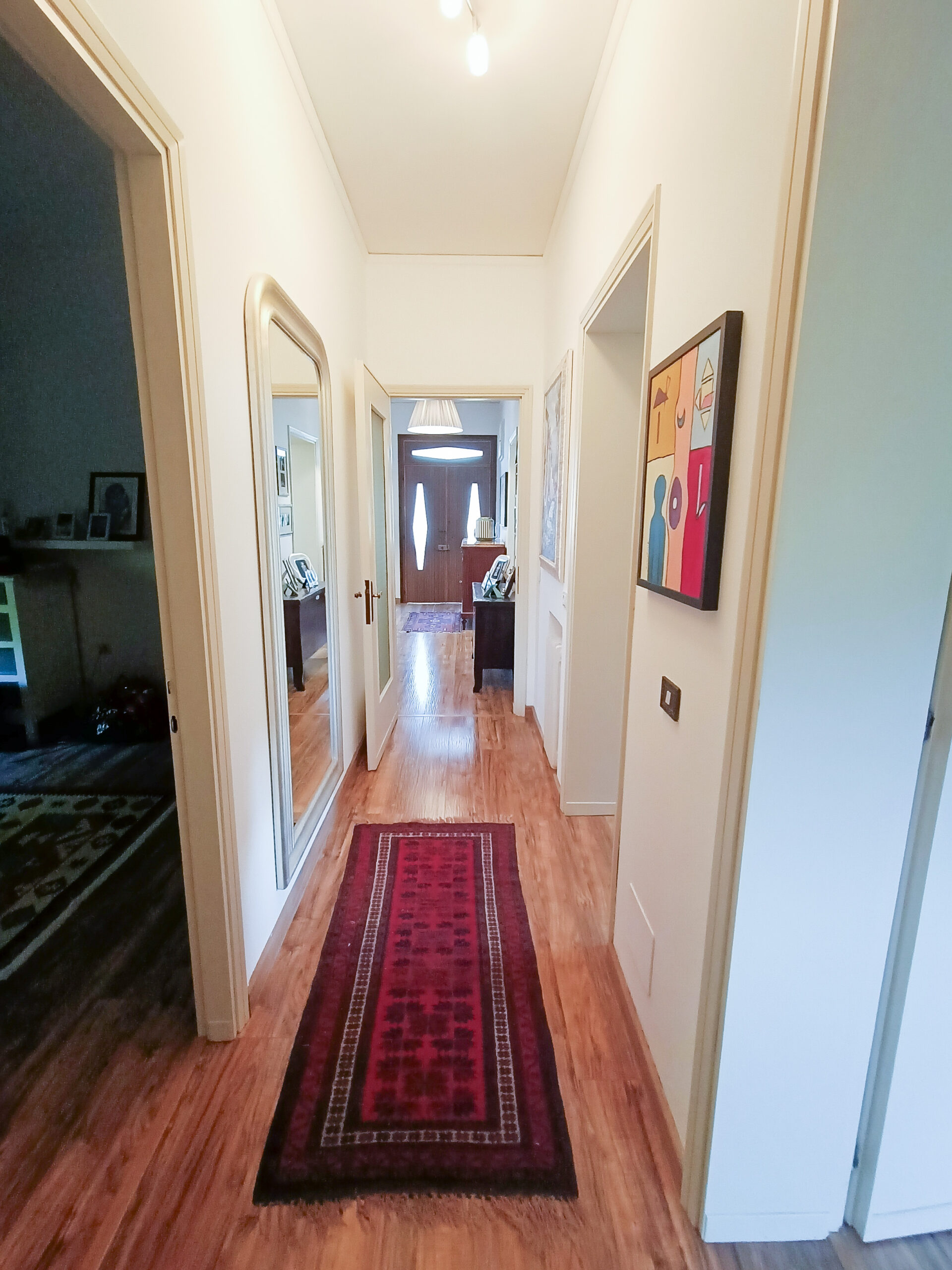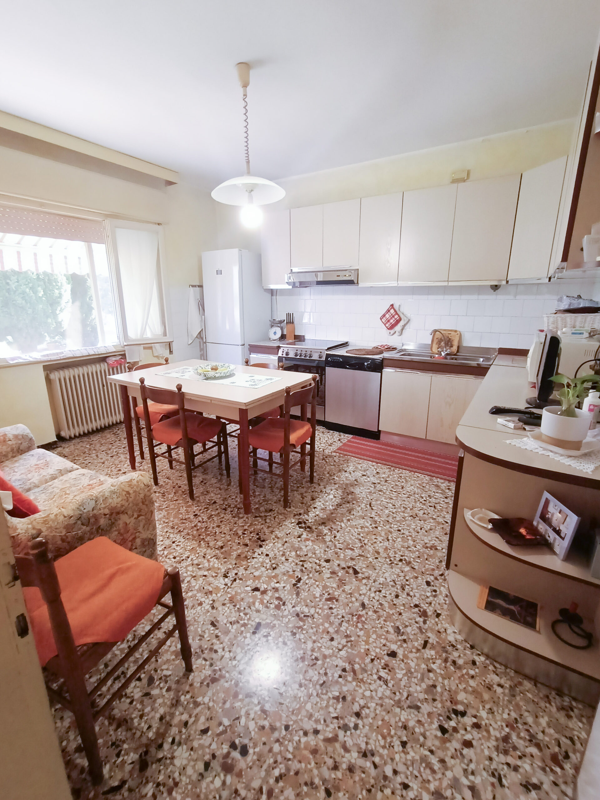 Si tratta di un’abitazione unifamiliare di ca. 240 mq attualmente suddivisa in due unità comunicanti tra loro, sia attraverso una scala esterna che una interna. Il piano terra è composto da ingresso su corridoio, cucina abitabile, soggiorno, una camera da letto matrimoniale, una cameretta, bagno con doccia, una stanza pluriuso ed un garage di 13 mq accessoriato di caminetto; al primo piano troviamo un’ampia zona living, una cucina abitabile con terrazzino, il corridoio, due camere da letto matrimoniali (di cui una con terrazzo), una cameretta ed un bagno con doccia.