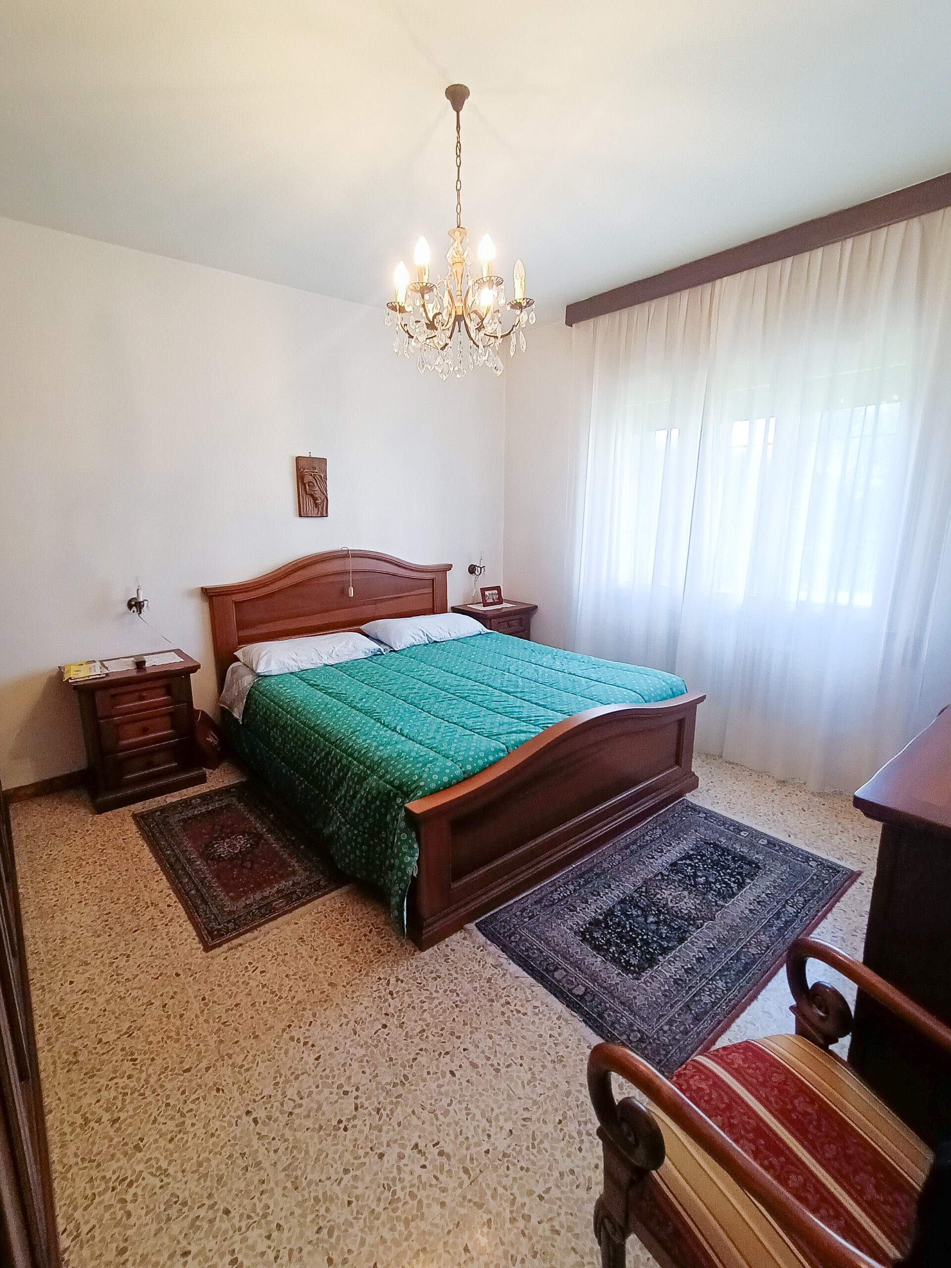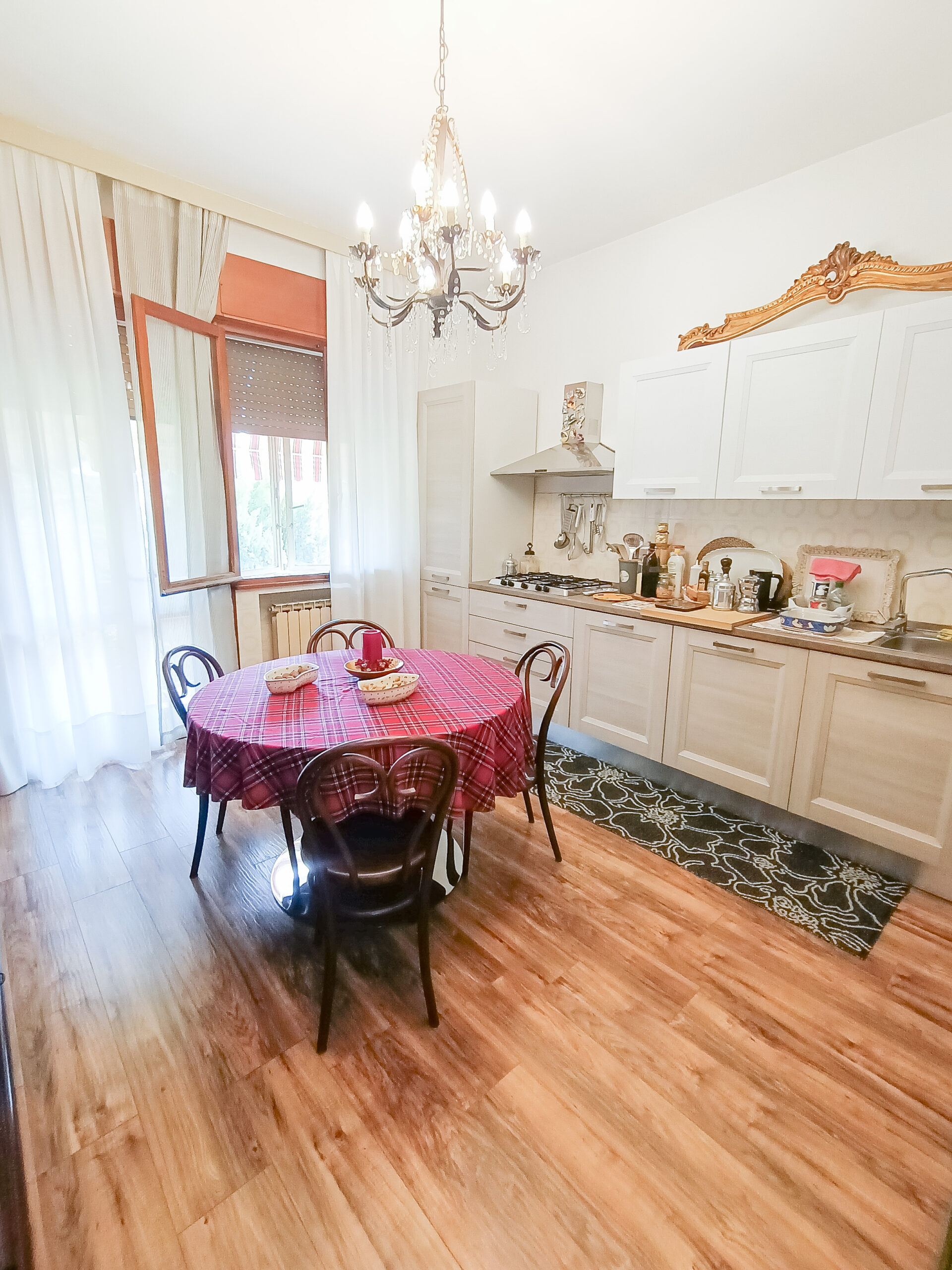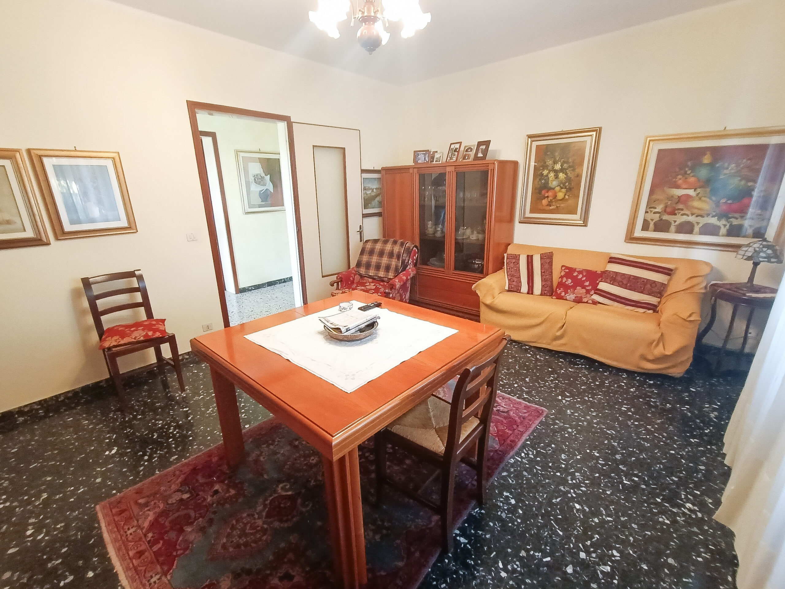 Si tratta di un’abitazione unifamiliare di ca. 240 mq attualmente suddivisa in due unità comunicanti tra loro, sia attraverso una scala esterna che una interna. Il piano terra è composto da ingresso su corridoio, cucina abitabile, soggiorno, una camera da letto matrimoniale, una cameretta, bagno con doccia, una stanza pluriuso ed un garage di 13 mq accessoriato di caminetto; al primo piano troviamo un’ampia zona living, una cucina abitabile con terrazzino, il corridoio, due camere da letto matrimoniali (di cui una con terrazzo), una cameretta ed un bagno con doccia.