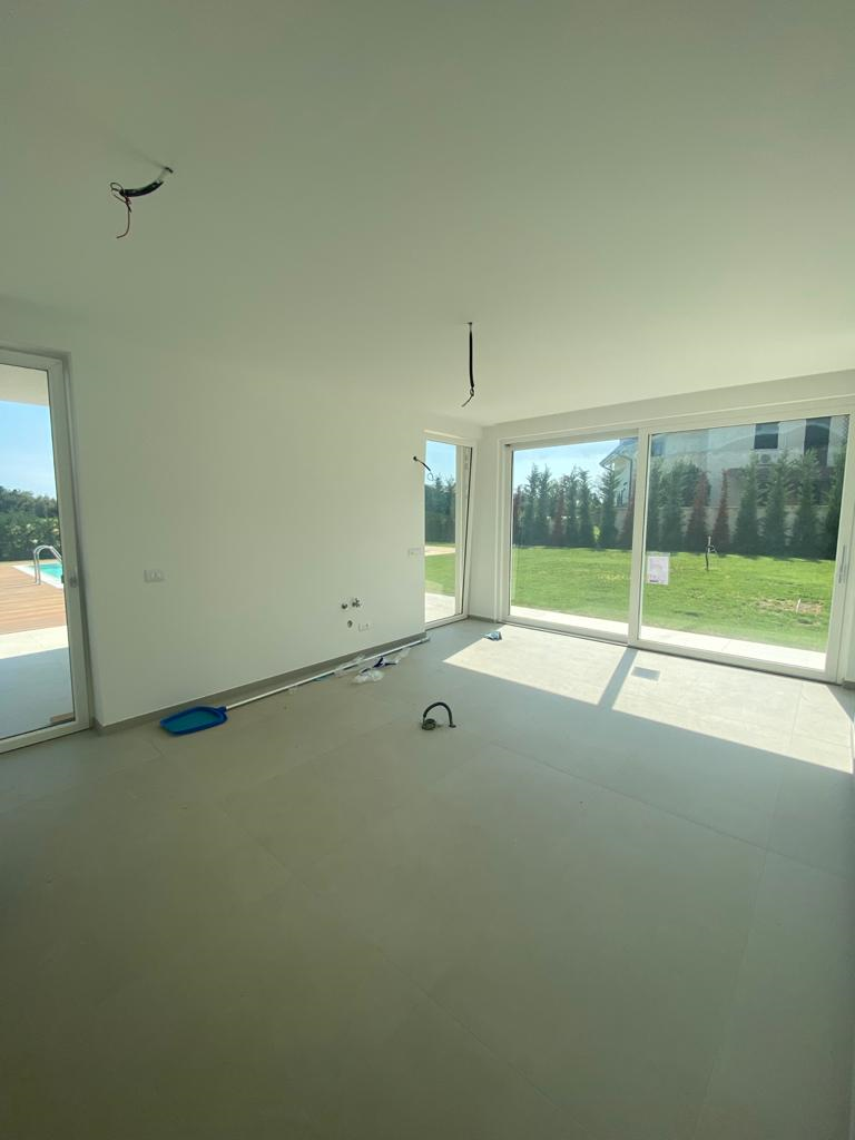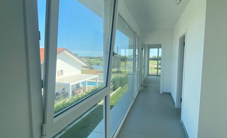 Il criterio progettuale prevede una elevatissima interazione visiva con l’esterno, effetto ottenuto tramite l’installazione di molteplici ampie vetrate in cristallo in modo che dall’interno, in qualunque stanza ci si trovi si goda del verde del parco, dell’ ampia piscina e della vista sul campo da golf.